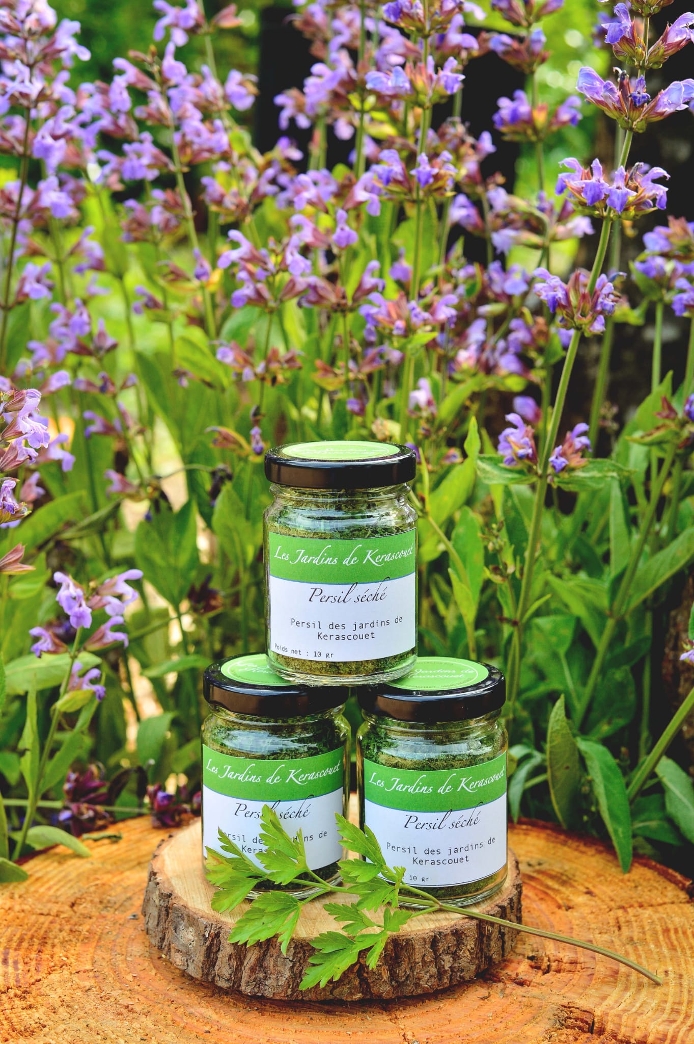pot de persil plat et frisé cultivé, récolté aux jardins de Kerascouet, séché et moulu dans notre atelier breton.
